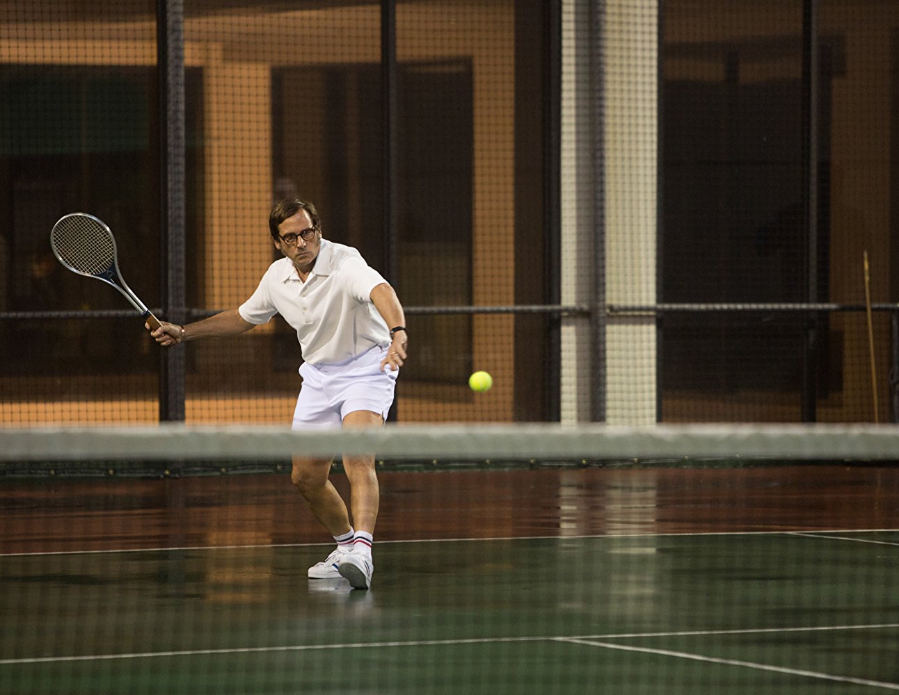 Carrell deja de lado la figura del payaso, pero exagera en la postura misógina de su personaje, rayando incluso en la burla y lejos de la convicción del verdadero Riggs, quien se decía un convencido de que las mujeres no deberían hacer deporte.